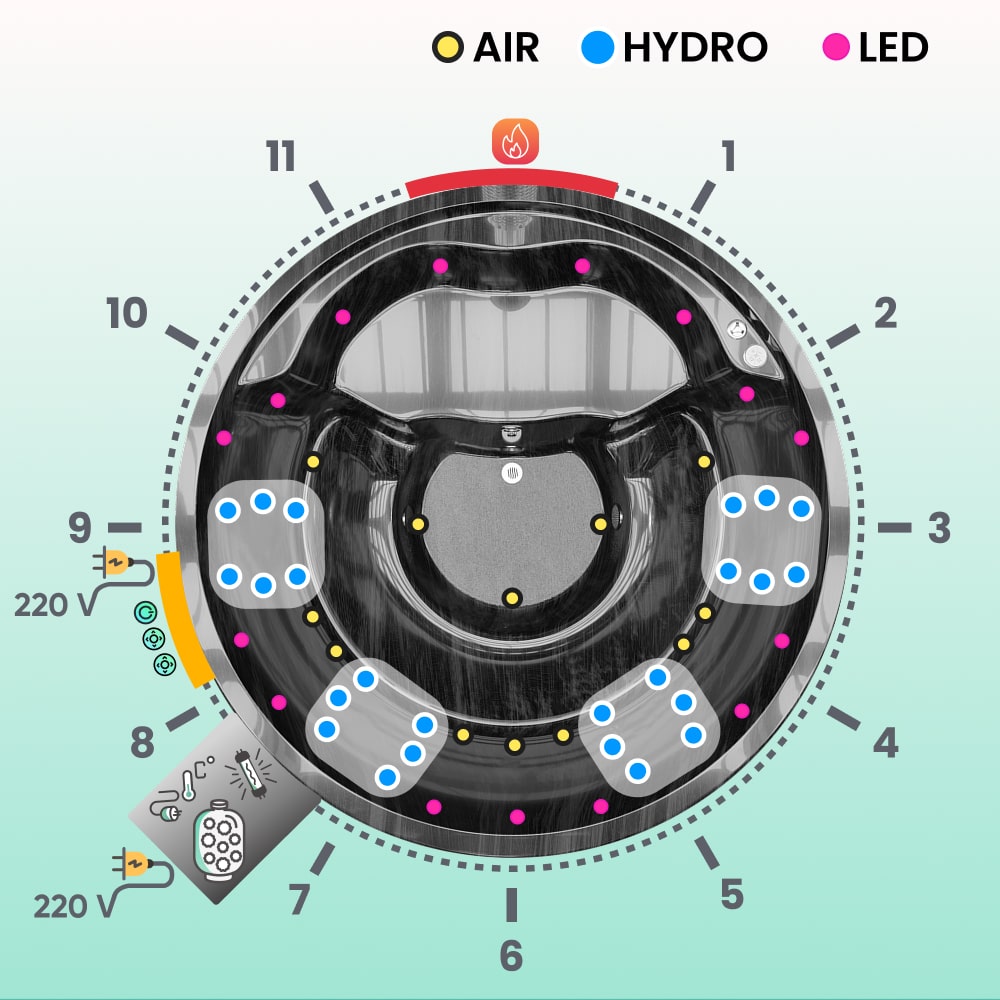 All-inclusive luxurious hot tub with a marble black acrylic insert and Premium filtration. This configuration includes: