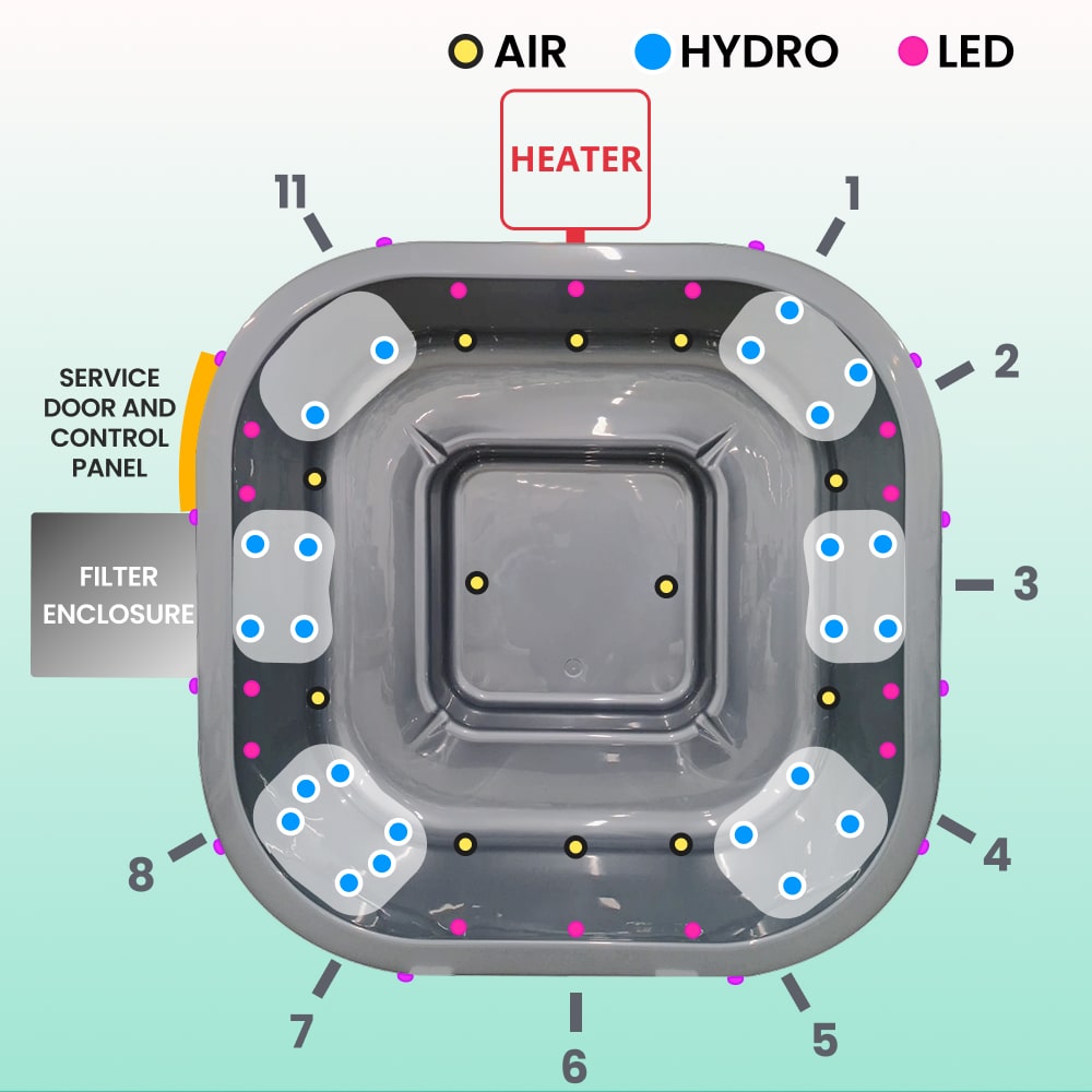 All-inclusive hot tub with a metallic grey acrylic insert and filtration. This configuration includes:
