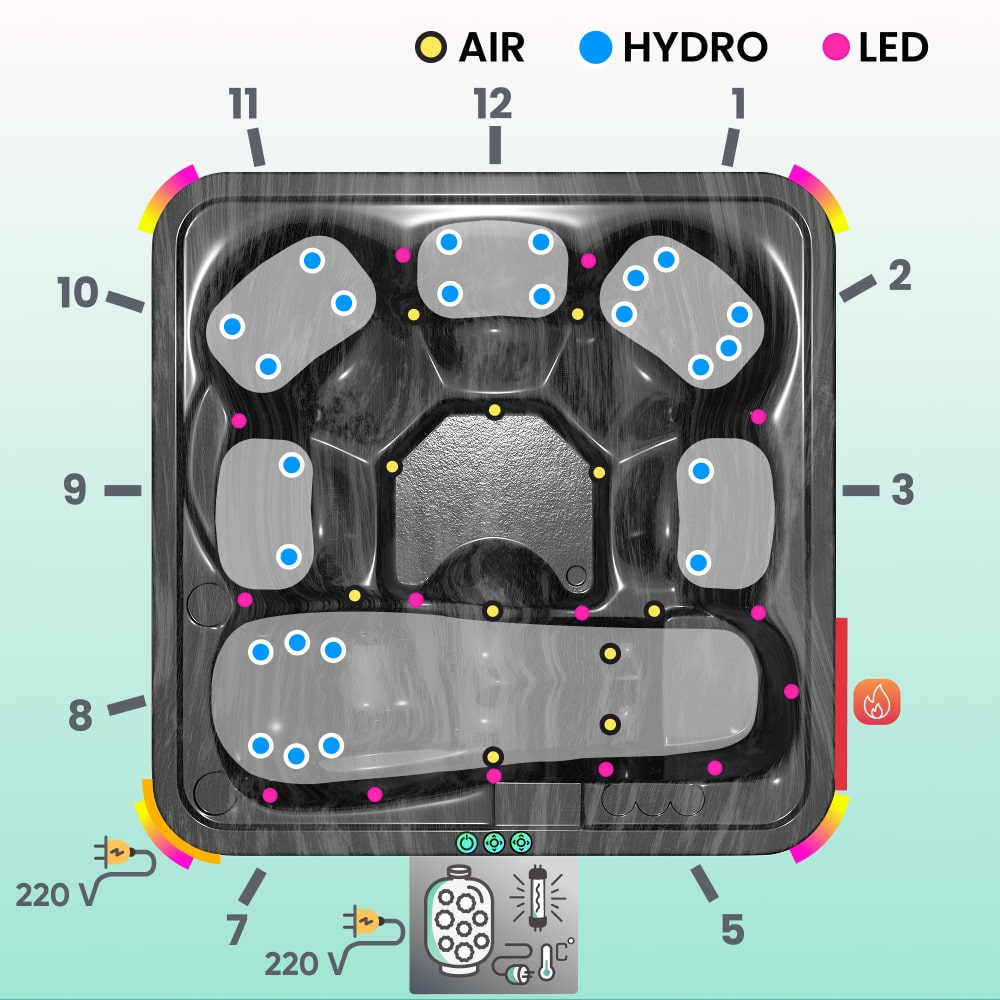 All-inclusive hot tub with a marble black acrylic insert and filtration. This configuration includes: