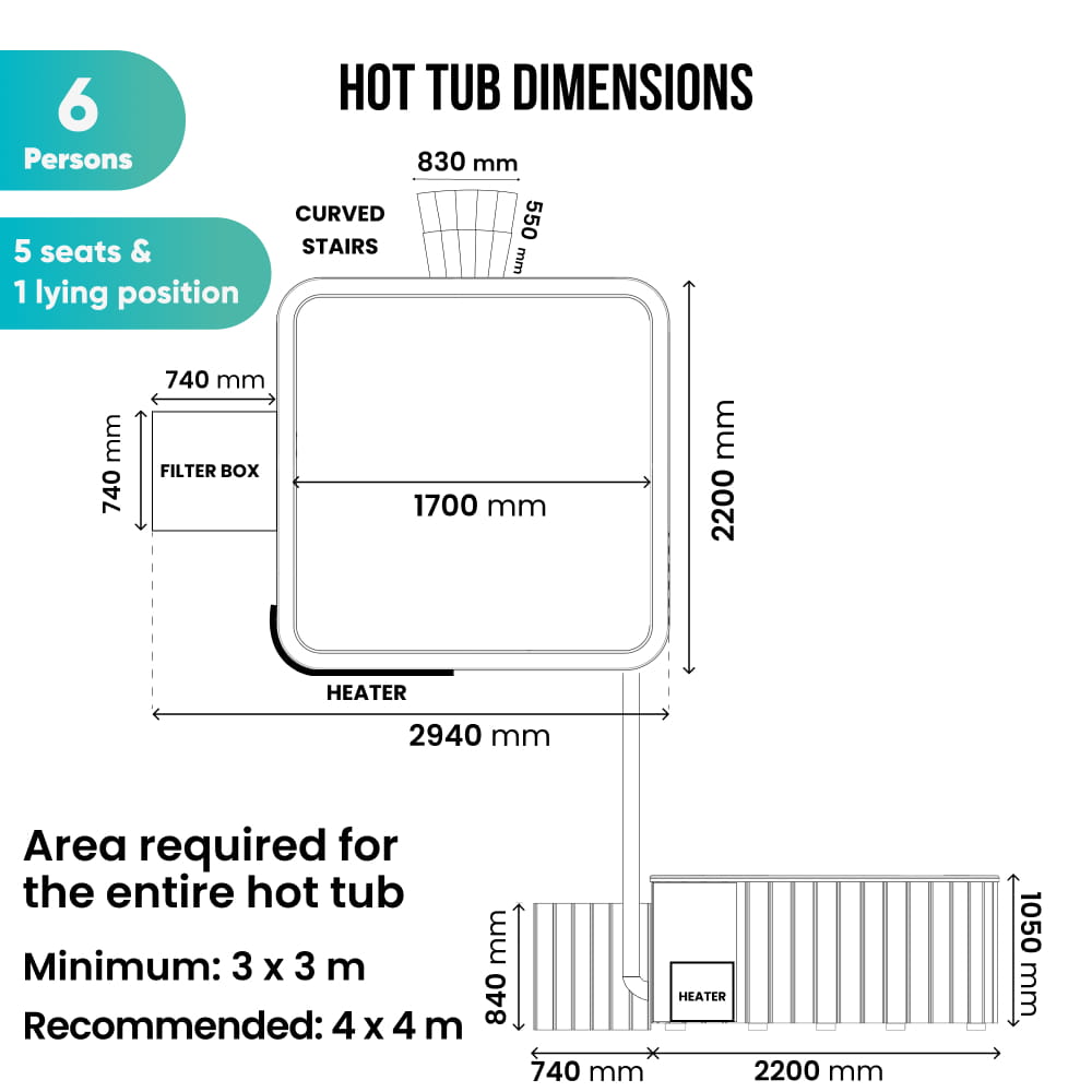 Internal dimensions of hot tub (L, W, H): 1700 x 1700 x 830 mm