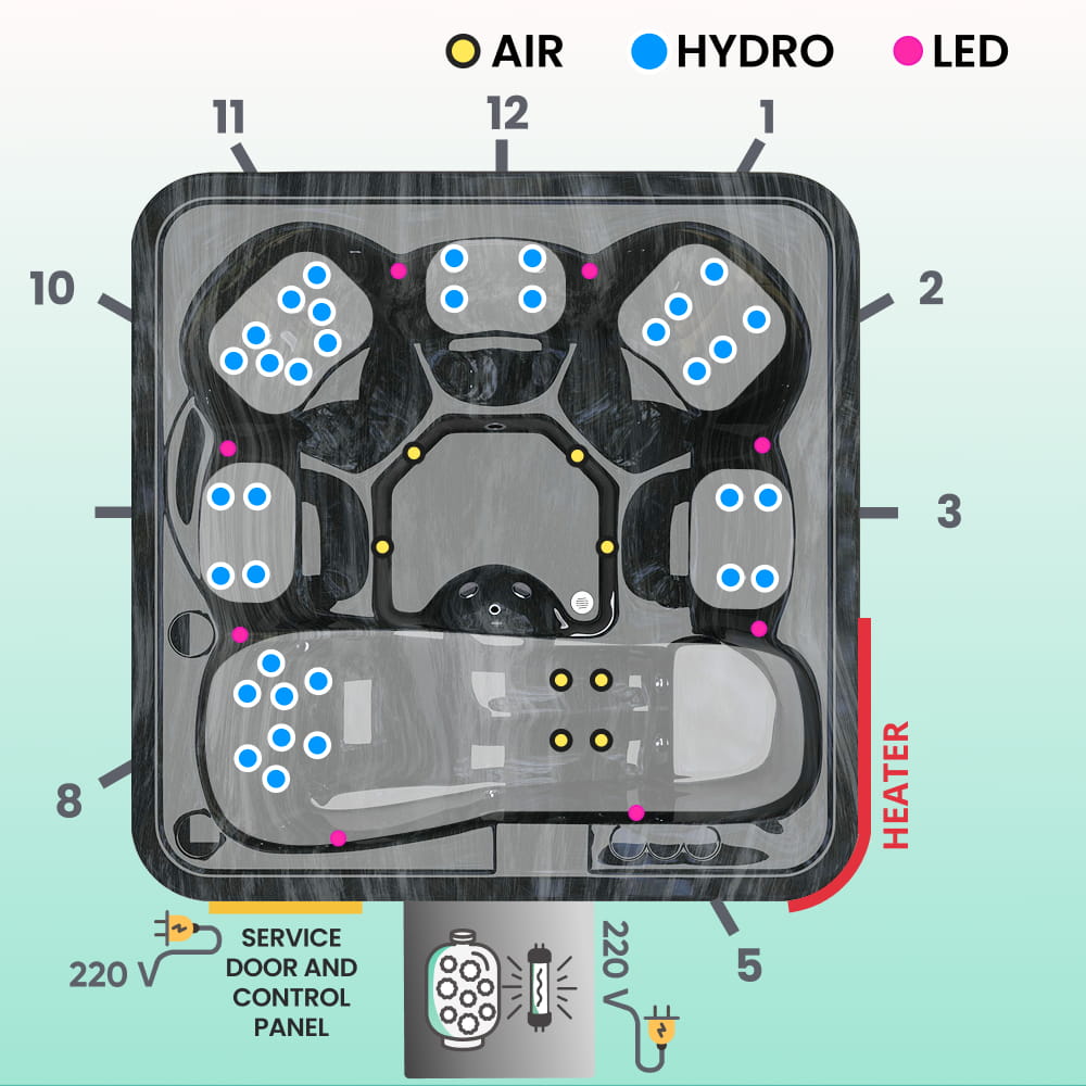 • 6-seater (5 seats and 1 laying position) hot tub with insert made of acrylic (marble black color) (£ 3900)