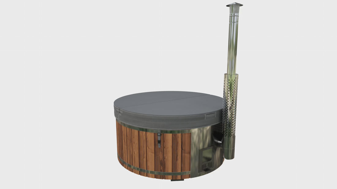 Outdoor corner view of wood fired hot tub with cover, small wooden steps, metal stove, and wood panel privacy walls