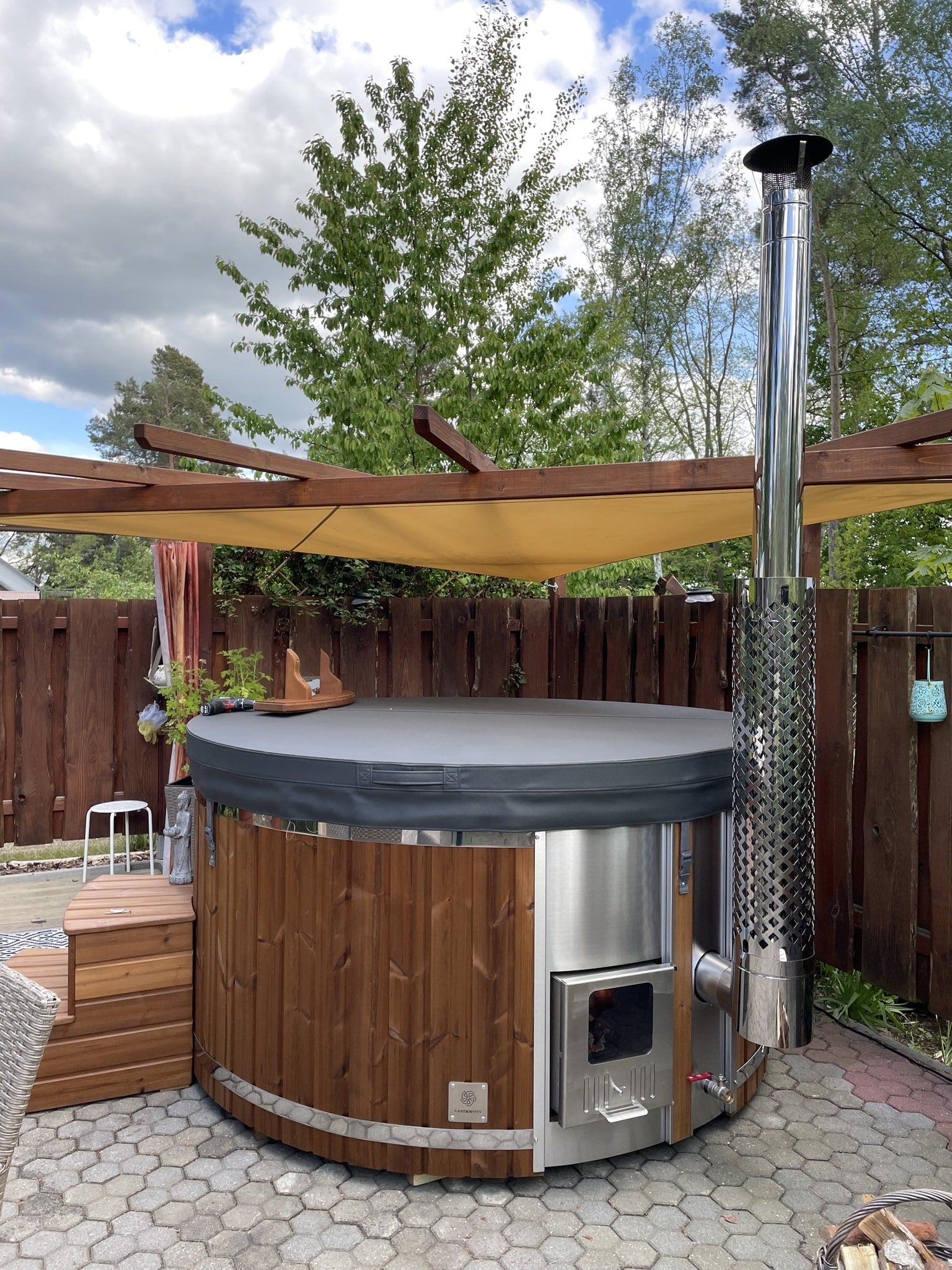 Compact Gardenvity wood fired hot tub placed under a terrace roof in a green backyard