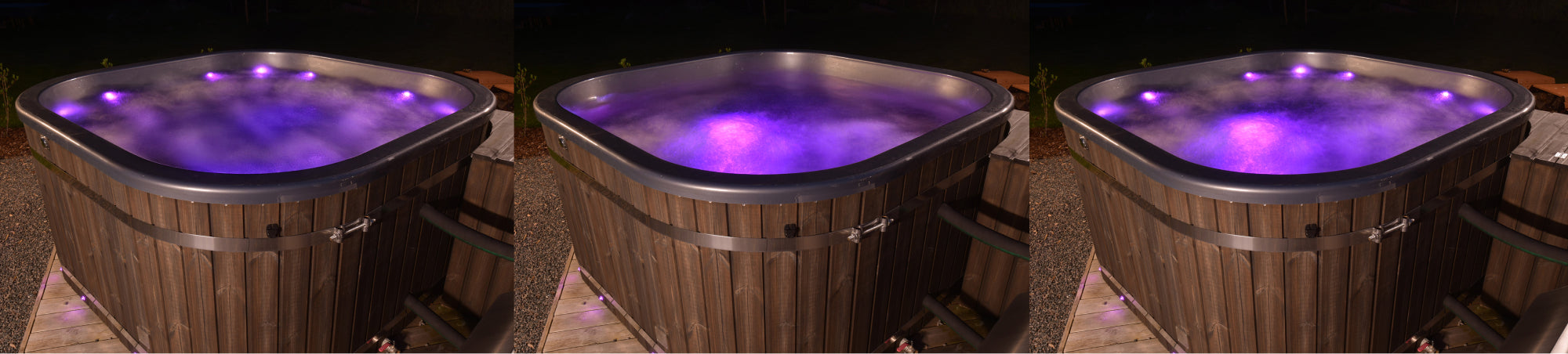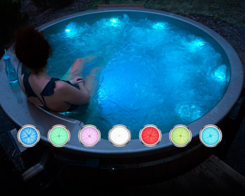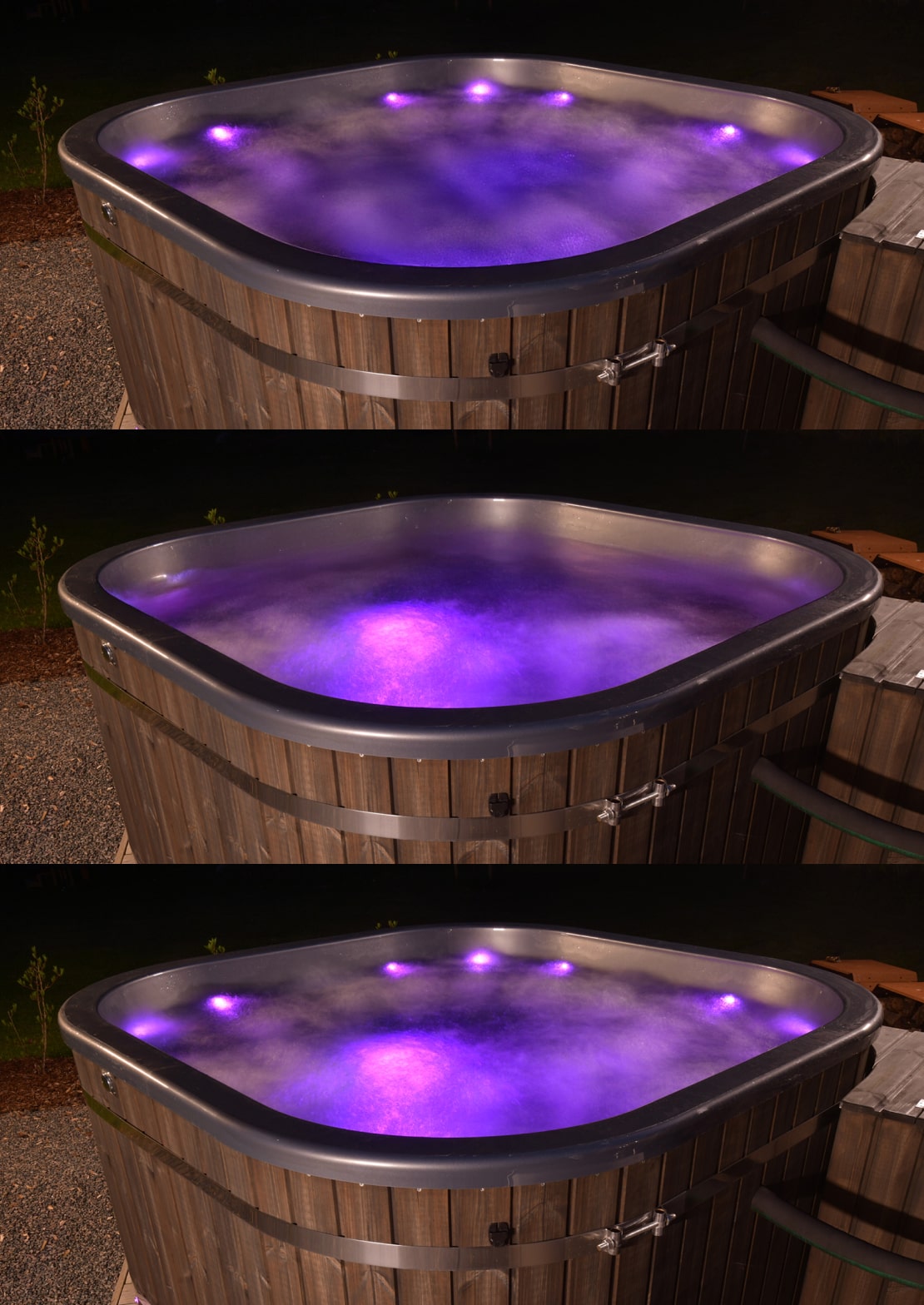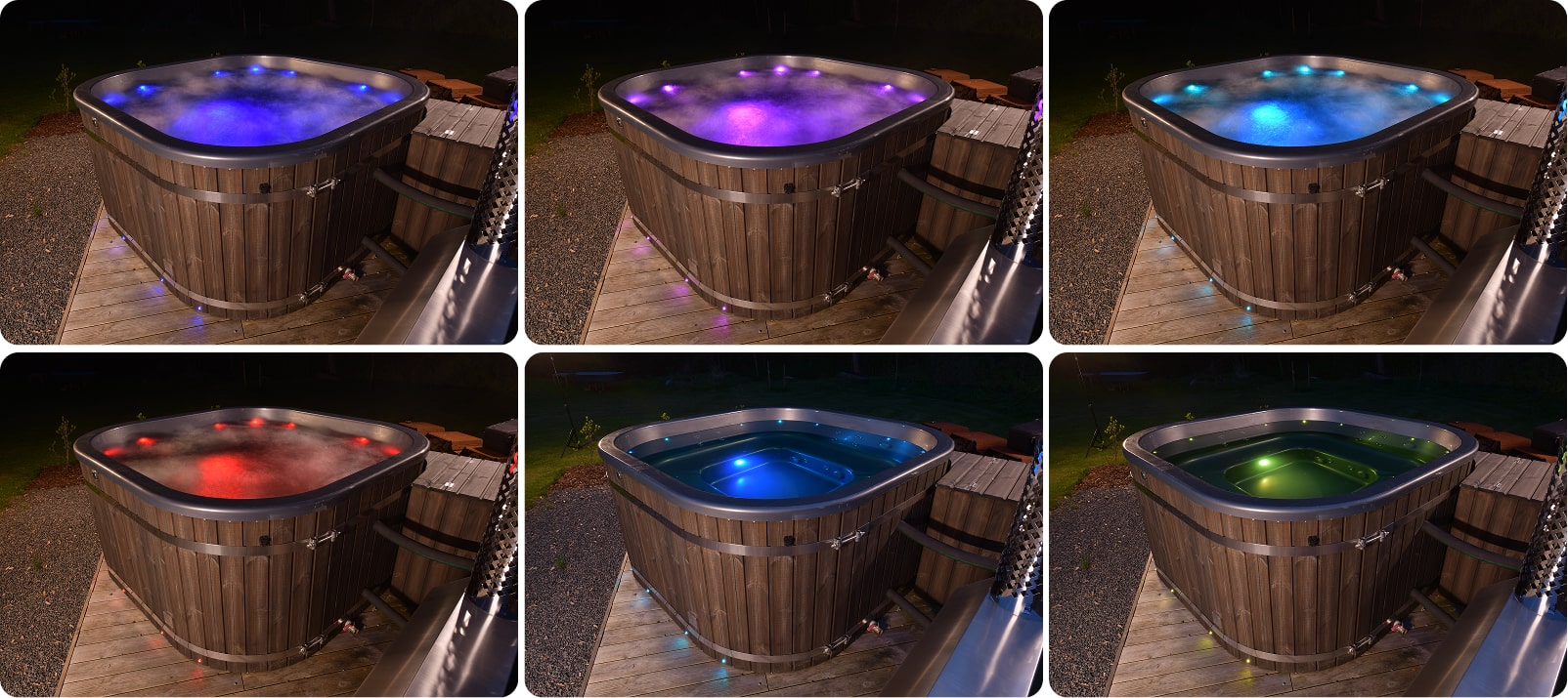 Zusammen schaffen sie einen wirklich strahlenden Hot Tub — mit spielerischen Farbwechseln sowohl im Wasser als auch leuchtend rund um das Äußere.