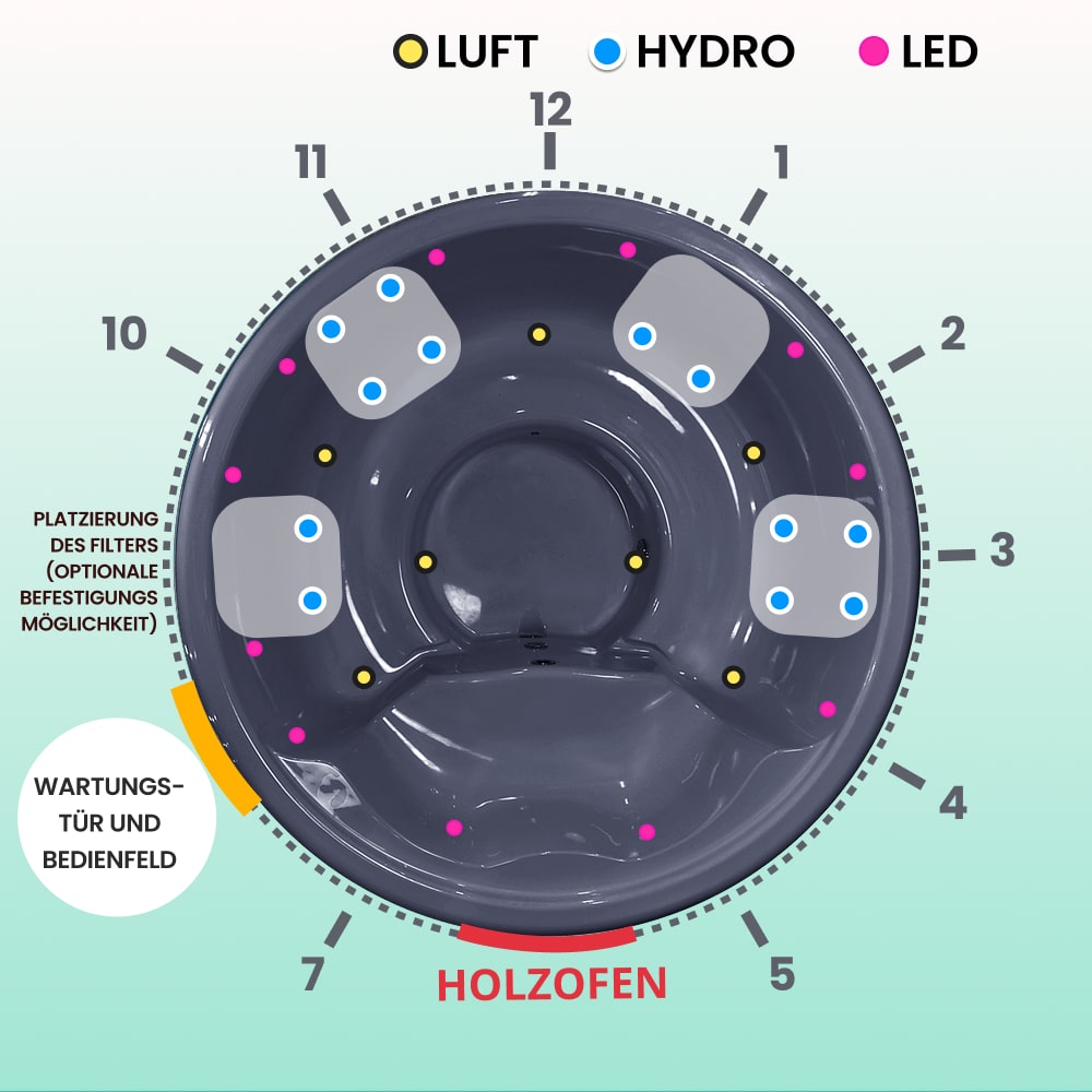 • Luftdüsen-Massagesystem, 7 Düsen, 0,7 kW (325€)