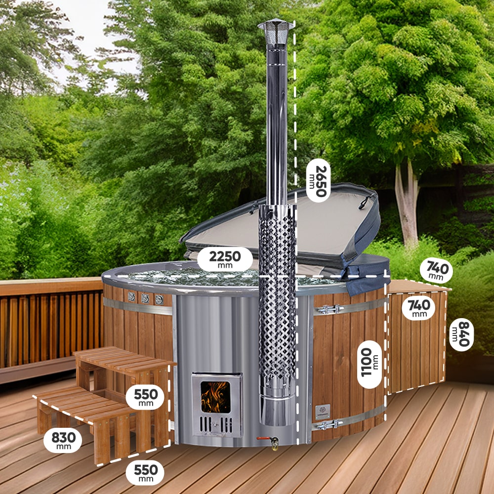 - Integrierter Holzofen aus Edelstahl AISI 316, mit Schornstein 2 Meter (700€)