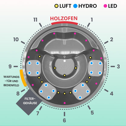 - Luftdüsen-Massagesystem, 12 Düsen, 0,7 kW (550€)