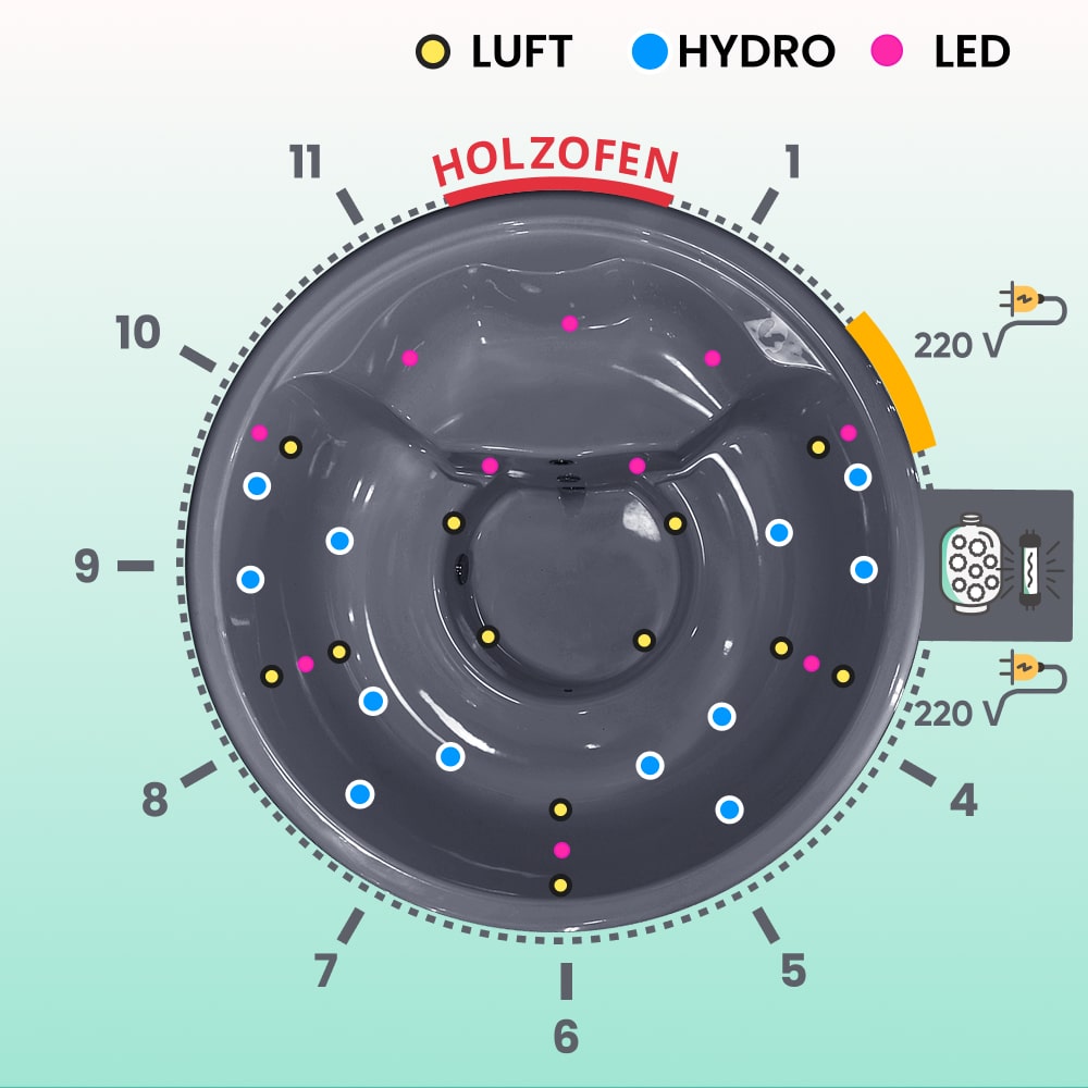 - Luftdüsen-Massagesystem, 12 Düsen, 0,7 kW (550€)