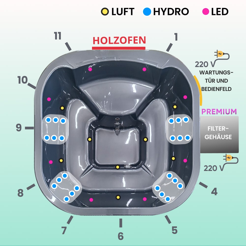 - Luftdüsen-Massagesystem, 8 Düsen, 0,7 kW (330€)