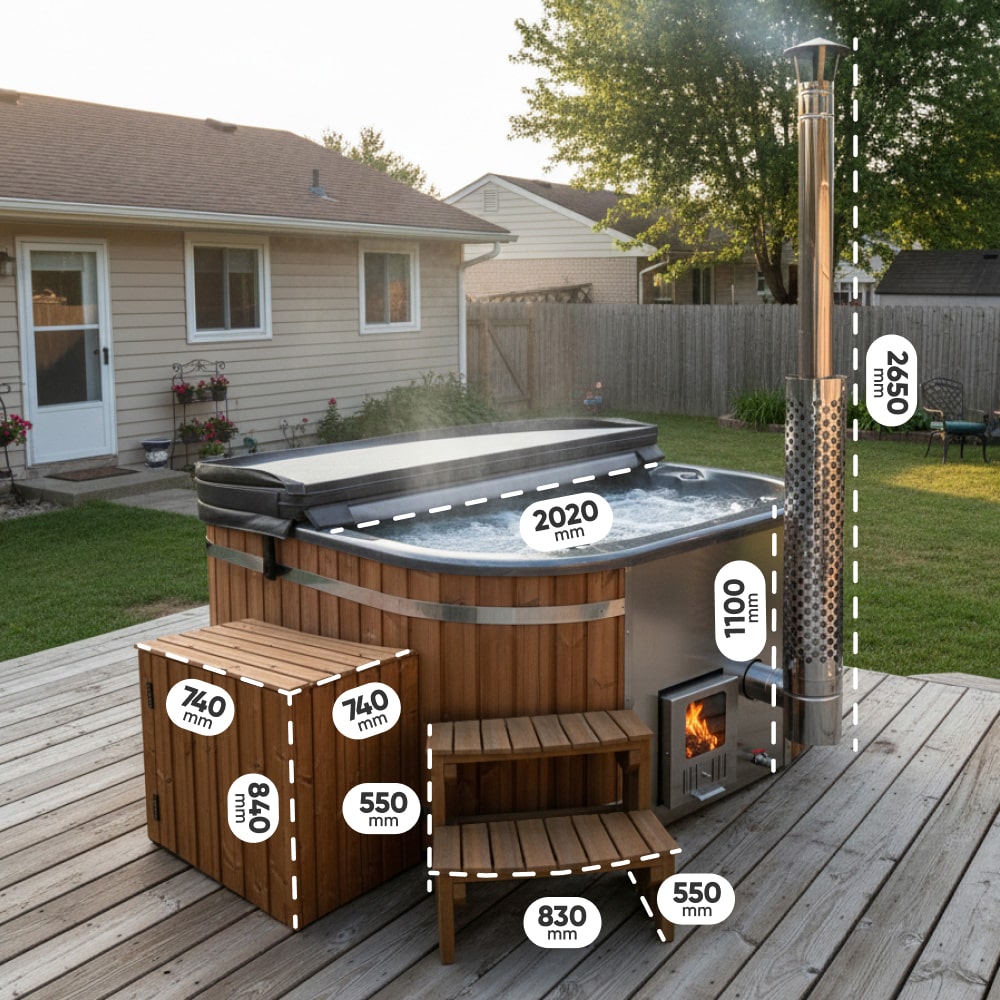 Whirlpool mit Holzofen – 24 Hydro-Jets, Relax Sitz | Für 4–6 Personen