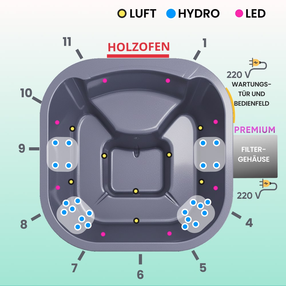 - Luftdüsen-Massagesystem, 8 Düsen, 0,7 kW (330€)