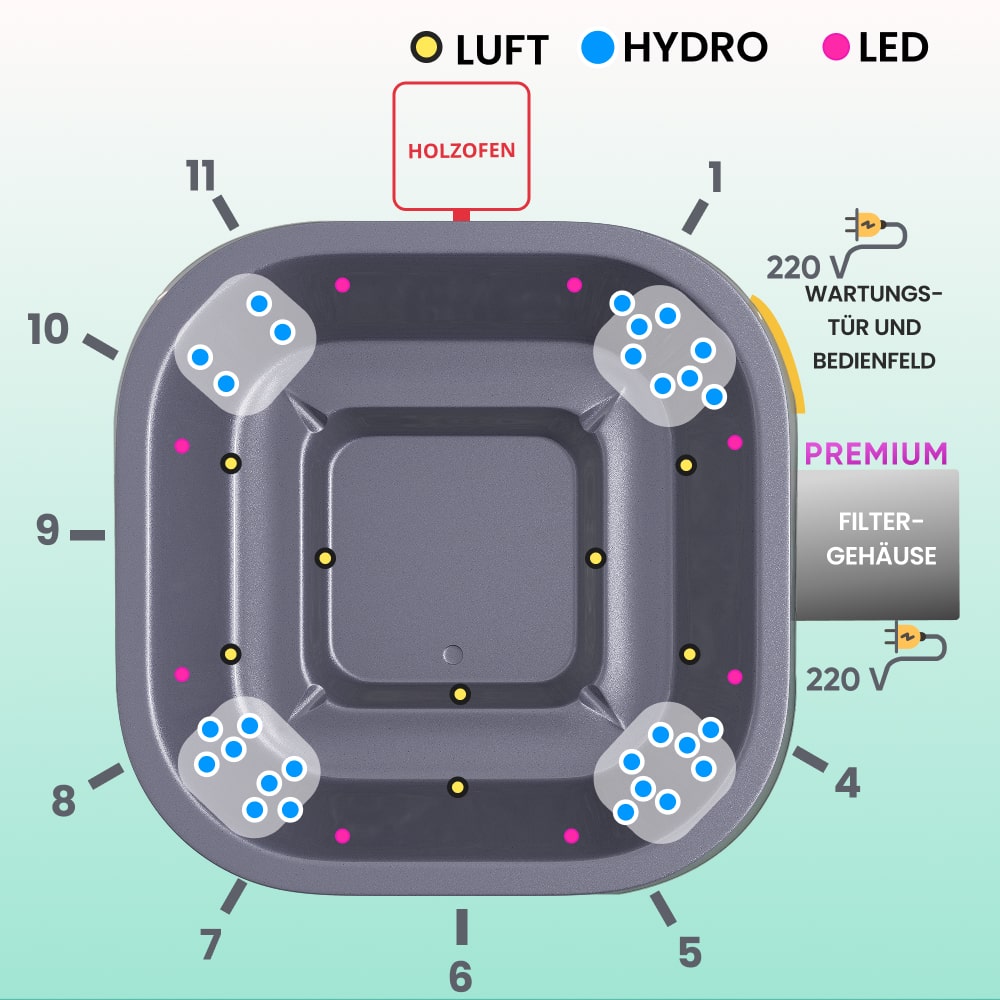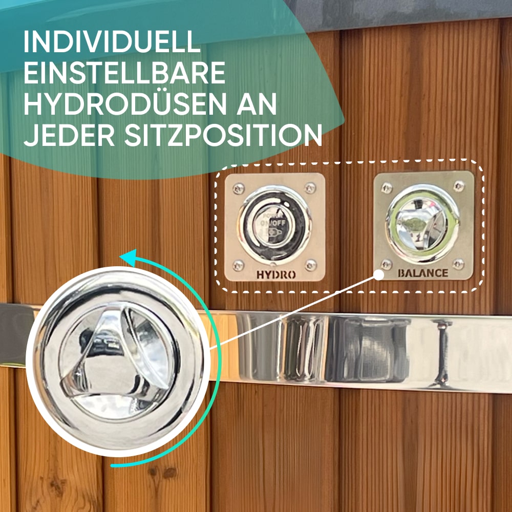 Whirlpool mit Holzofen – 28 Hydro-Jets, stärkster Außenofen | Für 4-8 Personen