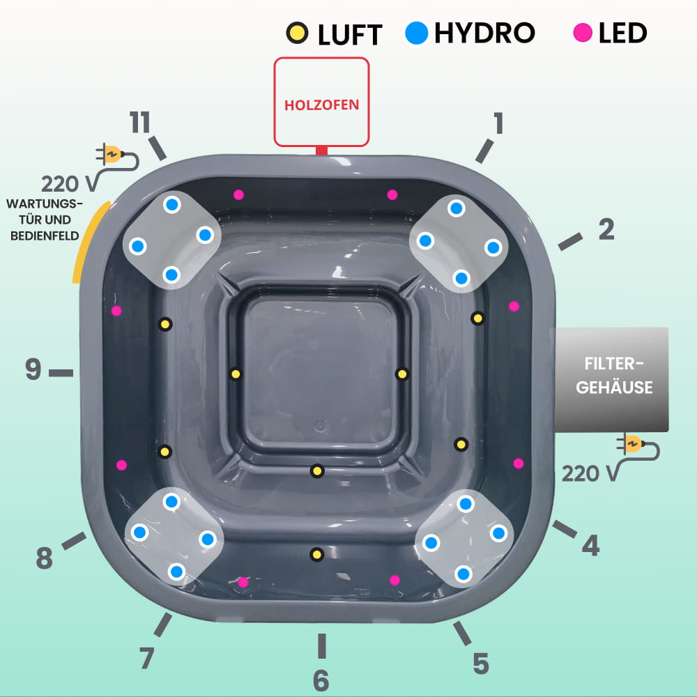 - Luftdüsen-Massagesystem, 8 Düsen, 0,7 kW (330€)