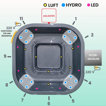 Whirlpool mit externem Holzofen | Filteranlage mit Sandfilter & UV-C Lampe | 16 Hydrodüsen | Für 4–8 Personen
