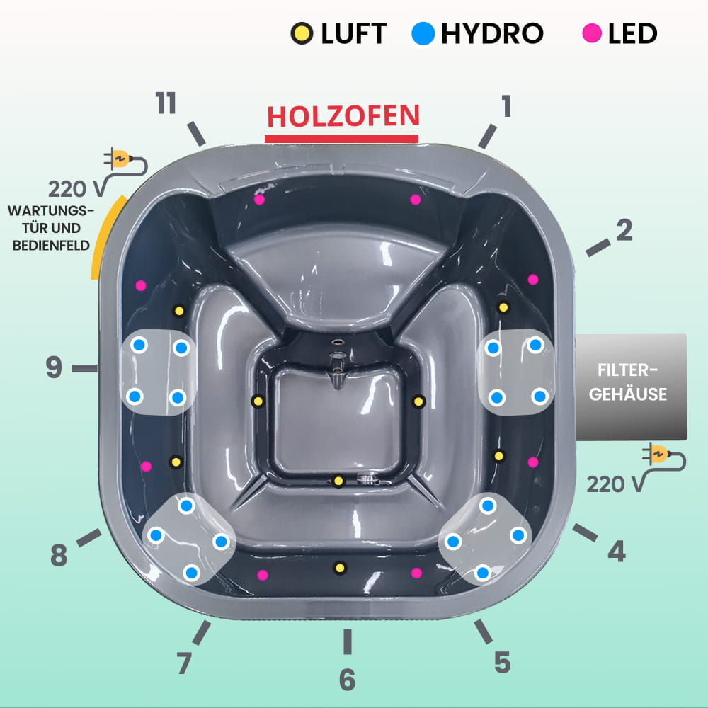 - Luftdüsen-Massagesystem, 8 Düsen, 0,7 kW (330€)